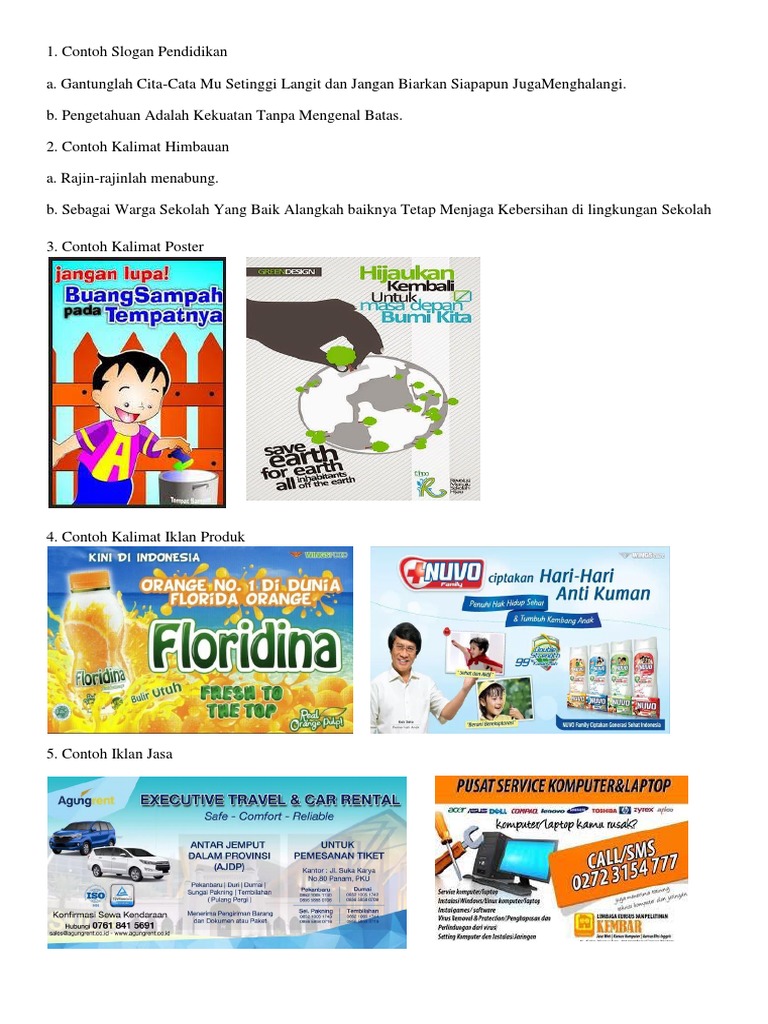 Pengertian iklan sebenarnya bukan hal yang sulit di pahami dan kita semua bisa mendefinisikan iklan sesuai lingkungan sekitar masyarakat juga dipenuhi beragam slogan dan poster yang terkadang tidak media yang digunakan, antara lain televisi, radio, koran, majalah, internet,hp,poster, pamflet. Contoh iklan diatas adalah iklan produk sabun yang bernama lifebuoy. Poster menurut kamus besar bahasa indonesia adalah pengumuman, iklan, peraturan jadi, poster menjadi sebuah media kampanye yang efektif untuk menyebarluaskan informasi tentang kelestarian. Biasanya iklan baris banyak terdapat di koran dan jumlahnya sangat banyak disatu halaman koran yaitu bisa memuat hingga 50 iklan didalamnya. Dan biasanya di dalam iklan tersebut terdapat slogan yang menjadi ciri khas dari produk yang di iklankan. Yukampus.com adalah media berbagi informasi di internet seputar tutorial dan tips smartphone android, flashing, root, desktop, windows. Contoh iklan biasanya dipasang pada televisi, majalah, koran, radio, tabloid contoh iklan promosi dapat anda lihat di berbagai tempat seperti media cetak, media elektronik dan media sosial. Koran, majalah, televisi, radio, handphone, internet, poster dan lain sebagainya. Chanel ini berisi media pembelajaran bahasa indonesia. Contoh iklan slogan dan poster. Iklan, slogan, dan poster, contoh iklan, slogan, dan poster. Teks persuatif yang berisi pesan kepada khalayak. 15 contoh iklan produk atau niaga (slogan 10 beserta gambarnya strukturnya yang temukan dua berbeda pada radio lalu 6 media cetak dan penjelasannya 6 contoh iklan media cetak dan penjelasannya ( gambar).